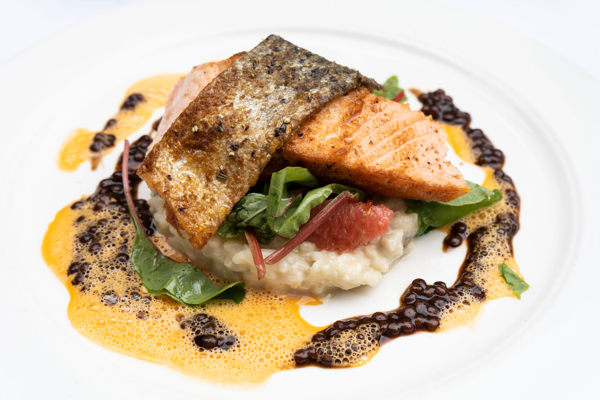 auf Gorgonzola-Sauce an Zartweizen-Risotto mit Corn Ribs