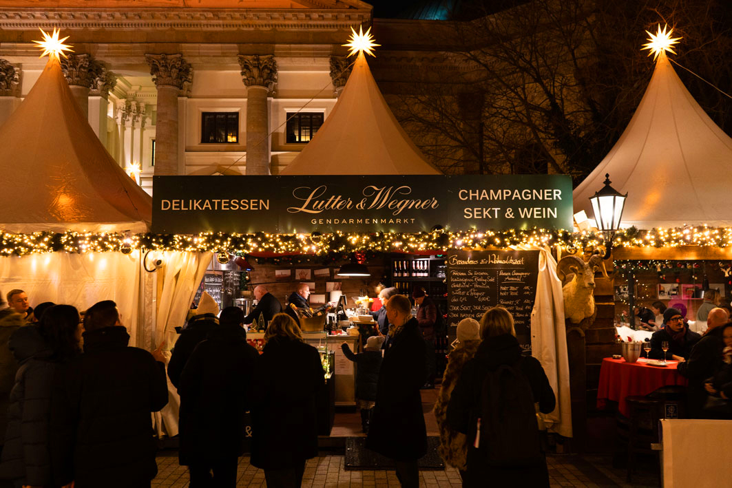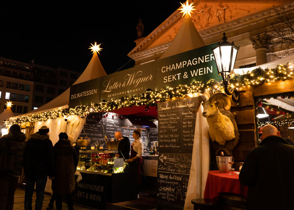 Herzlich Willkommen in der Adventsszeit in unserer gemütlichen Lutter & Wegner Weihnachtshütte auf dem wohl schönsten Berliner Weihnachtsmarkt – dem „Weihnachtszauber am Gendarmenmarkt“. Ab November 2025 wieder regulär auf dem vollständig sanierten Gendarmenmarkt beheimatet!
